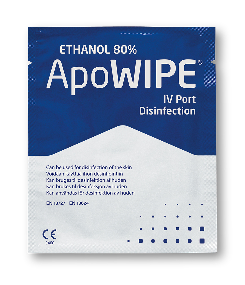 ApoWIPE Ethanol 80% desinfiointiliina soveltuu injektioporttien, korkkien sekä erilaisten liittimien desinfiointiin sekä paikalliseen ihon desinfiointiin.